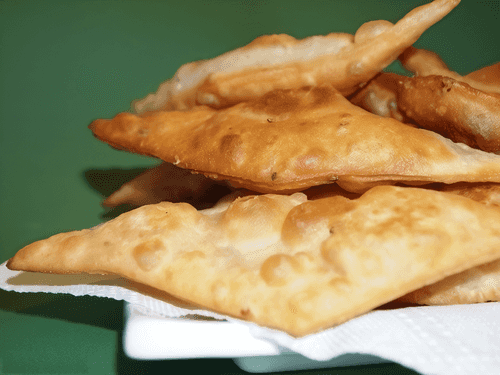We heat several tablespoons of ghee in a pan so that the rhombuses can submerge in it. We dip the rhombuses in the oil. After the crackers brown on one side, we flip them to the other.