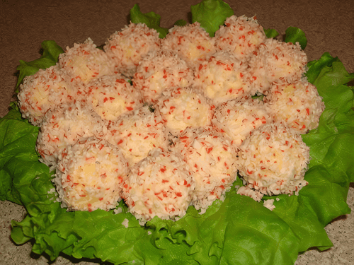 Grate crab sticks on a coarse grater and roll the prepared cheese balls in it.