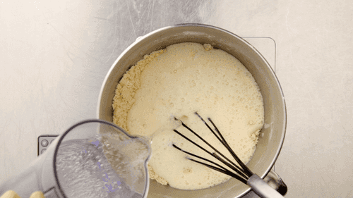 For the batter, mix chicken broth, 40 ml sesame oil, 100 ml vegetable oil, baking powder, and a pinch of salt until smooth. Then add corn flour and 400 g of wheat flour and mix again. Finally, add water to achieve a uniform consistency.