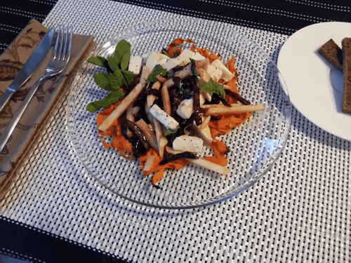 Cut the apples into strips. Cut the cheese into random pieces of 1-2 cm. Mix 2/3 of the apples, cheese, and beetroot with white wine vinegar and olive oil, and sprinkle with basil and mint.
