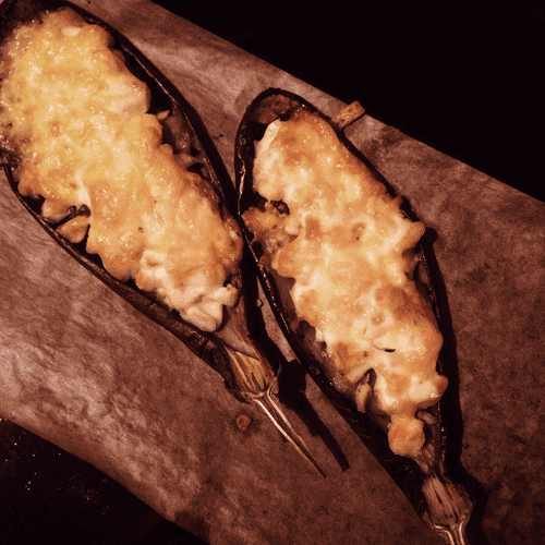 Remove the flesh from the eggplants to create a 'boat'. Finely chop the flesh and fry until cooked.