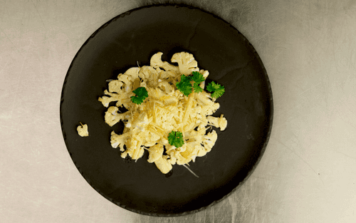 Grate Parmesan with a vegetable grater into the cauliflower, mix. Place the cauliflower on a plate, drizzle with truffle oil. Garnish with chicken feathers on top and serve.