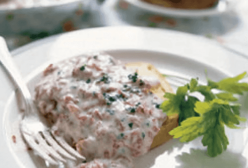 Dried beef in creamy sauce is an elegant dish with Italian roots, stemming from peasant cuisine traditions where the ability to transform simple ingredients into exquisite flavors was highly valued. Here, tender dried beef acquires a rich, concentrated aroma enhanced by a creamy sauce with hints of nutmeg and white pepper. The warm, silky sauce envelops crispy pieces of meat, creating a harmonious blend of textures. Served on a crispy toast adds a pleasant contrast of flavors. This dish is perfect for both a cozy home dinner and a rustic Italian-style breakfast. The ease of preparation combines with rich flavor, making it a favorite choice for those who appreciate simplicity and sophistication at the same time.