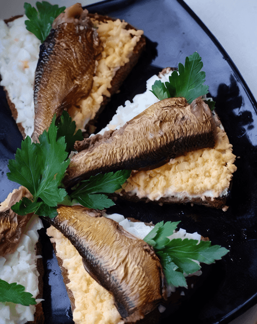 Top with 1 or 2 sprats, optionally add sliced cucumber rings and garnish with greens. It can be served warm or chilled.