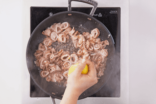 Fry the squid for 5 minutes, stirring constantly. During frying, drizzle with lemon juice, salt, and pepper. Serve the squid hot, sprinkled with parsley.