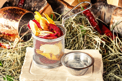 Crispy vegetable chips are a light and sophisticated snack that combines the natural flavor of fresh vegetables with an appetizing crunchy texture. Originating from European cuisine, this recipe is a great alternative to traditional potato chips. Carrots, beets, and potatoes are sliced thinly, baked with olive oil and salt, and then brought to perfect crispness. Their taste is vibrant, naturally sweet with light caramelized notes. A special zest is added by a creamy sauce based on mayonnaise and sour cream enriched with the aromas of fresh basil, garlic, lime, and lemon zest. These chips are perfect as an appetizer snack and can also serve as an original side dish for meat or fish.