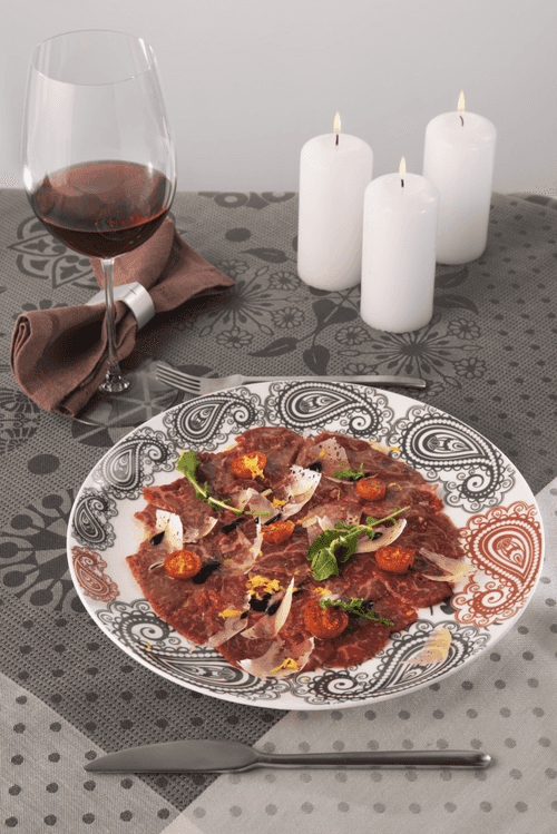 Carpaccio was invented only 56 years ago, but it seems like it has always been around. The original version of this cold appetizer is raw beef tenderloin petals under lemon dressing with olive oil and balsamic sauce. To be able to cut the meat thinly, it needs to be slightly frozen. In addition, you can add baked cherry tomatoes (as we did), or you can simply add arugula. And of course, what Italian dish would be complete without parmesan: here you can simply crumble it or cut it into thin slices.