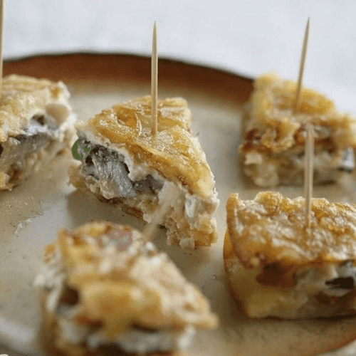 Omelet appetizer with herring and cream cheese is an original combination of simple ingredients that creates a rich flavor and delicate texture. The roots of this dish trace back to European cuisine, where snack omelets with unusual fillings are popular. Crispy fried potatoes provide a base for the dish, eggs add lightness, and aromatic garlic and dill bring freshness. Herring, with its piquant saltiness, harmoniously complements the cream cheese, creating a balance of flavors. This appetizer is perfect for festive tables or buffets: miniature triangles are easily served on cocktail sticks and look impressive. The combination of the omelet's softness, the filling's tenderness, and a slight saltiness makes this dish not only tasty but also memorable.