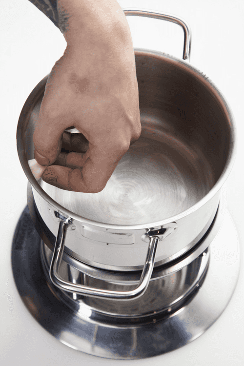 Rub the walls and bottom of the fondue pot with a clove of garlic.