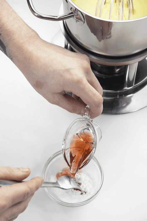 Mix starch with cherry liqueur, add to the cheese mixture, and continue stirring without letting it boil. As soon as the starch and cheese become inseparable, start eating immediately, dipping bread into the cheese and anything else you desire.