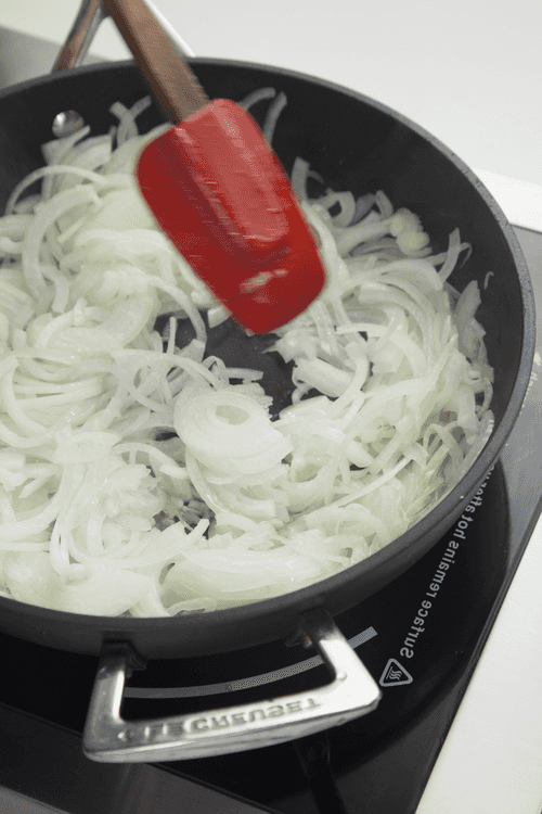 Slice the onion into half rings and add to a pan with heated vegetable oil. Season with salt and pepper, and simmer over medium heat, stirring until the onion releases its juice.