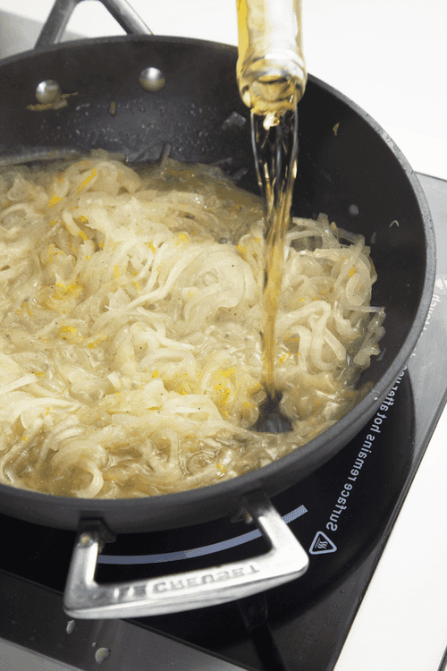 Add sugar, a bit of sherry, some orange juice and zest, and continue to sauté the onion, stirring occasionally and waiting for the liquid to evaporate and the onion to take on a caramel color. This will take 15-20 minutes, but you can continue longer. You can add sherry from time to time.