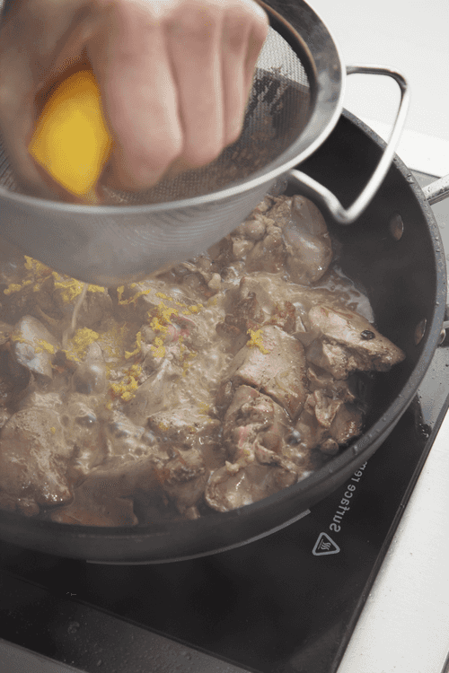 Put the prepared onion aside. In the same pan, add oil and lightly fry the liver, adding salt and pepper. It should be browned on the outside and tender pink on the inside. Add zest, juice, and sherry to the liver. Remove from heat.