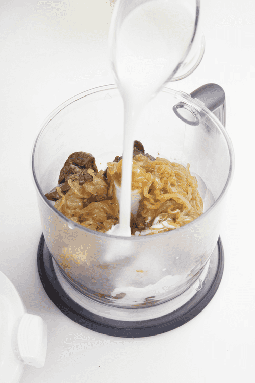 Put onion and liver in a blender, pour in cream, and blend. Gradually add small pieces of frozen butter to the pâté and continue blending.