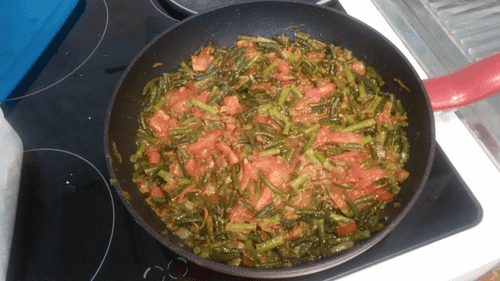 When the tomatoes release juice, we add garlic scapes to the pan. When the scapes change color and become soft, we turn off the heat.