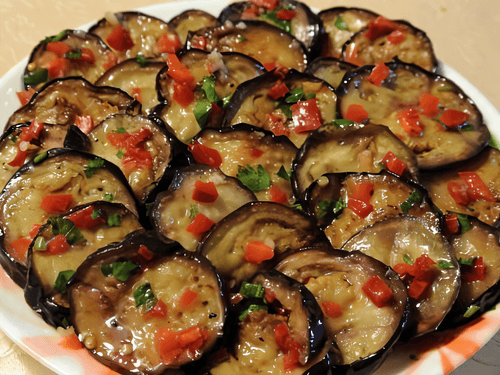 Put the eggplants in a jar and pour sauce over them. Place in the refrigerator.