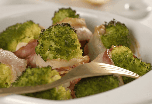 Place a slice of cheese and a broccoli floret on each strip of bacon and wrap tightly.