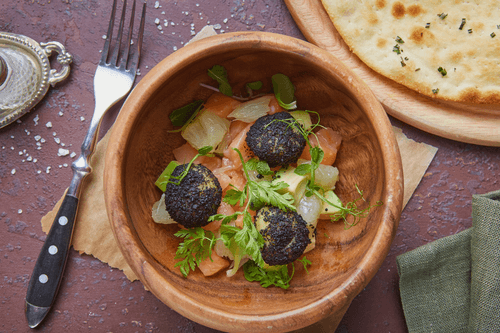 Salmon tartare with pomelo is a refined dish of French cuisine that combines freshness and tenderness with a hint of spiciness. The flavorful and textured salmon harmoniously intertwines with creamy avocado and the refreshing citrus accent of pomelo. A dressing of olive oil, salt, and pepper highlights the natural shades of the ingredients, creating a balance of flavors. Mashed potatoes formed into miniature balls and coated with olive crumble add depth and originality, making the dish not only a gastronomic delight but also a visual masterpiece. This tartare is perfect as a light appetizer before the main course or as part of an exquisite tasting menu, emphasizing the elegance of French culinary traditions.