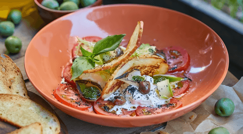 Slice the tomatoes into thin rounds and arrange them on a plate, seasoning with salt, pepper, and olive oil on top. Place Stracciatella cheese on the tomatoes.