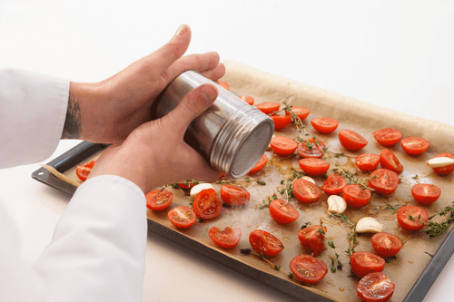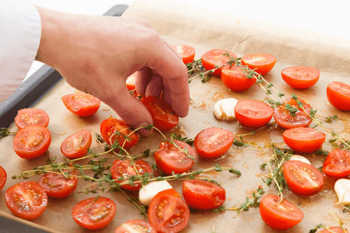 Spread everything evenly on a baking sheet lined with parchment paper. The tomatoes should be placed cut side up.
