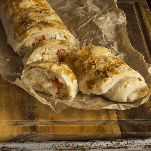 Roll out the puff pastry to a thickness of 3-4 mm. Place the filling on it, roll the dough into a log, brush with egg, and sprinkle grated Gouda cheese on top.
