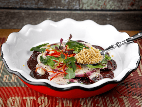 On the salad, we place marinated beet slices, add artichoke paste, mix in ricotta, and torch it with a gas burner.