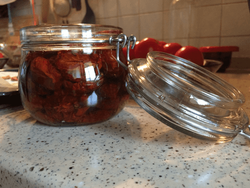 To store tomatoes, place them in a jar, cover with olive oil, and put in the refrigerator.