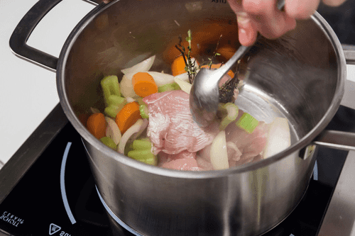 Cut the onion, carrot, celery, and chicken into large pieces. Sauté in olive oil with thyme sprigs. Then add 500 ml of water and cook for 10-15 minutes.