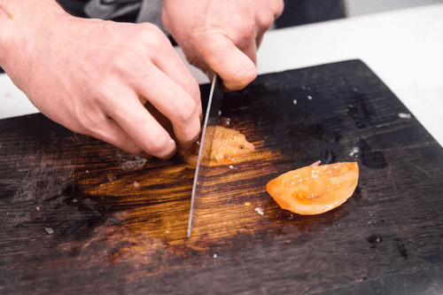 Chop the onion, garlic, and herbs finely. Peel the tomato and remove the seeds, then dice it into small cubes.