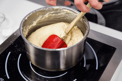 Add the puree and flour, knead for 10 minutes over low heat. Then remove from heat and cool.