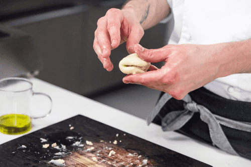 Take some potato dough, knead it in your hands, roll it into a ball, make a flatbread, place chicken filling on the flatbread, and shape it into a droplet-shaped pie.