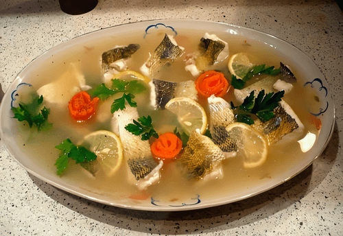 Sea bass aspic is an exquisite dish of Vietnamese cuisine that combines the tenderness of sea fish with the richness of aromatic broth. This recipe traces back to the traditions of Vietnam's coastal regions, where fish has always been an important part of gastronomy. The sea bass, infused with spices and vegetables, acquires a rich flavor, while the transparent jelly made from aromatic broth adds elegance to the dish. Lemon freshness and crunchy carrots complement the composition, creating a harmony of textures. This dish is perfect for festive tables and ceremonial events, and its chilled structure makes it especially refreshing on hot days. Sea bass aspic is a gastronomic masterpiece embodying the art of cooking and the subtlety of flavor nuances.
