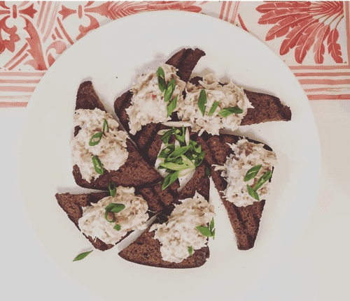 Toast Borodinsky bread on a grill pan. Top with forshmak and garnish with green onions.