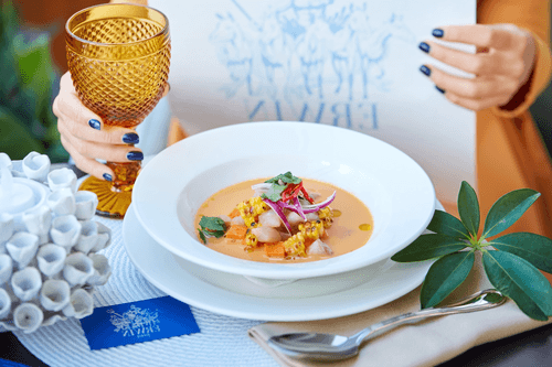 Classic Peruvian ceviche made from sea bass with sweet potato and corn is the essence of flavors that conveys the spirit of traditional Peruvian cuisine. The origins of this dish date back to ancient times when local fishermen marinated freshly caught fish in citrus juice. The tender sea bass fillet is infused with a vibrant, spicy sauce made from coconut milk, lime, ginger, and chili, creating an explosive taste. The side of baked sweet potato and corn adds sweet notes and balances the spiciness. Toasted corn gives a light smoky aroma, while fresh cilantro completes the composition. This dish is perfect for a refreshing dinner that combines exoticism and harmony.