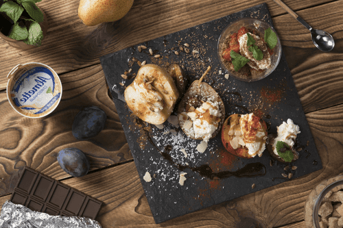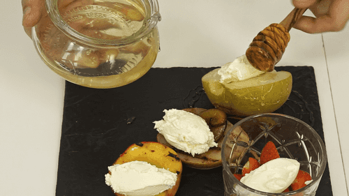 Drizzle the apple with honey and decorate with roasted seeds, sprinkle the nectarine with almond flakes and paprika. Place caramelized plum on the pear, decorate with almond flakes and white chocolate shavings. Garnish the strawberry with dark chocolate shavings and mint leaves.