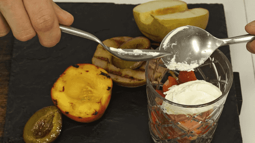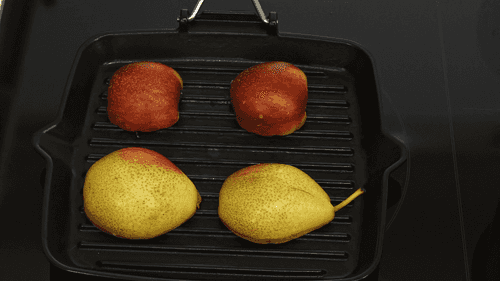 Cut the pear in half and remove the core. Halve the nectarine and remove the pit. Grill both fruits in a grill pan.
