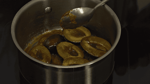 Remove the pits from the plums. In a small saucepan, heat the sugar and add butter. Caramelize the plums in this.