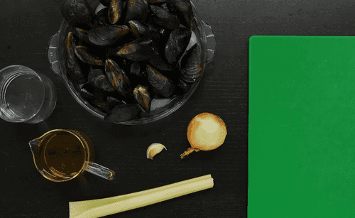 Prepare the necessary ingredients. Rinse the mussels and clean them from the 'beards'.