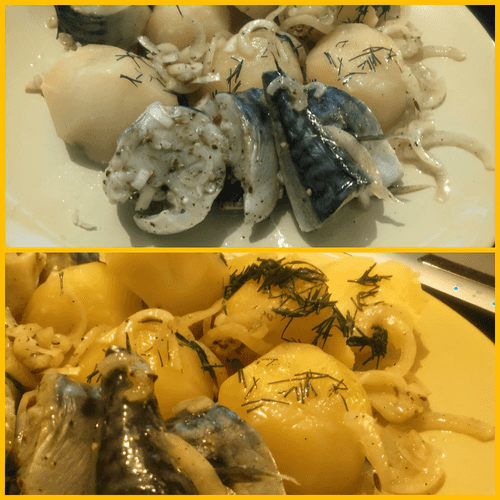 Mix salt, pepper, and 9% vinegar. Add oil and mix again. Add onion, garlic, and mackerel to the mixture and mix again.