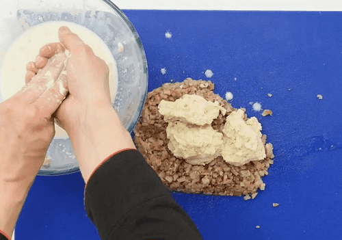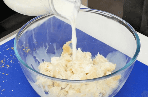 Remove the crusts from the buns, crumble them, and soak in milk. Leave for 5-10 minutes.