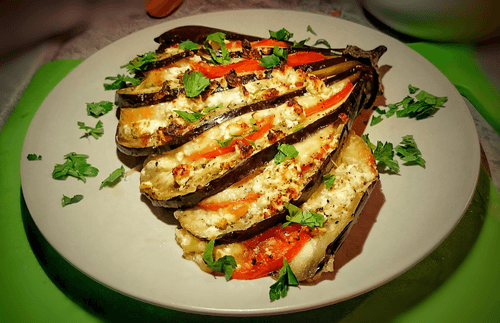 Wash the eggplant and slice it into petals. Layer each petal with a couple of tomato slices and a couple of mozzarella slices.