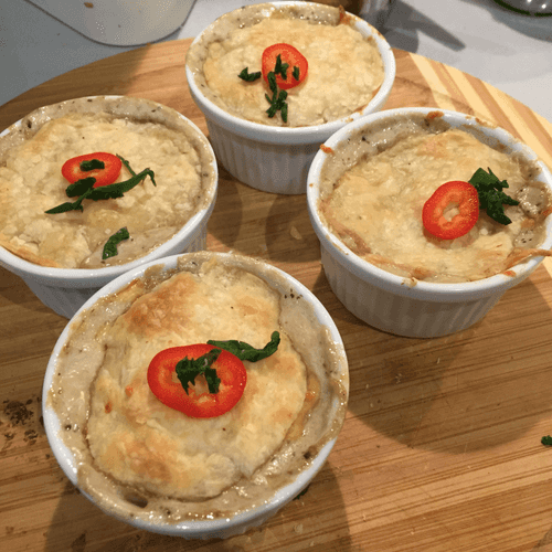 Place the filling in the cocottes, then sprinkle with grated cheese and cover with puff pastry.