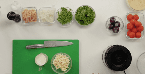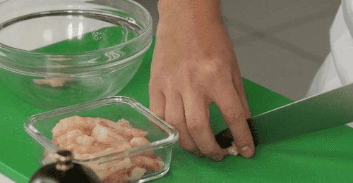 Cut the shrimp in half. Slice the red onion into thin strips, blanch the tomatoes, peel them and cut them randomly.