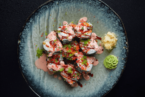 Pour spicy and unagi sauce on top, and sprinkle with tobiko caviar. Serve with pickled ginger, wasabi, and soy sauce.