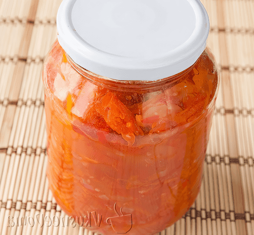 Salad of sweet peppers, tomatoes, and carrots for winter is a bright and flavorful gift of Hungarian cuisine. Its history roots in the traditions of winter preparations when housewives aimed to preserve the summer freshness of vegetables in jars. Sweet pepper adds juiciness and aroma to the dish, tomatoes provide tenderness and acidity, while carrots add a light sweetness. Onions fried to a golden color reveal depth of flavor, and spices harmoniously bind all ingredients together. This salad is perfect as a side dish for meat and fish dishes, complementing them with freshness and spiciness. It also pairs wonderfully with bread and can serve as an independent snack on festive tables. Canned in jars, it will delight you during the winter months, reminding you of warm sunny days.