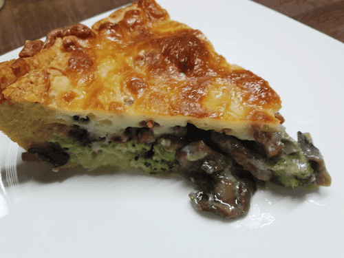 Lorraine pie is a classic dish of French cuisine named after the Lorraine region. Its delicate puff pastry combines with a juicy filling of broccoli, mushrooms, and bacon, creating a harmony of flavors. The aroma of sautéed mushrooms and bacon adds richness to the pie, while mozzarella contributes softness and a creamy texture. The filling made from eggs, milk, and flour makes it especially tender. This pie is perfect for a cozy family dinner or festive table, delighting guests with its exquisite taste and appetizing appearance.
