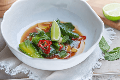 Cucumbers with mint are a refreshing and spicy dish inspired by the lightness of Italian cuisine. Its roots trace back to Mediterranean culinary traditions, where the freshness of herbs and the spiciness of sauces create a harmony of flavors. Crunchy cucumbers soak up an aromatic shiso sauce mixed with soy and sesame oils, gaining a rich umami taste. The light sweetness of sugar enhances the depth of the dish, while garlic and red chili pepper add spiciness. The main highlight is mint, which gives the dish an unmatched freshness and lightness. This salad works well as a standalone dish or as a side to fish and meat. It refreshes perfectly on warm summer days and becomes a vibrant addition to any table.