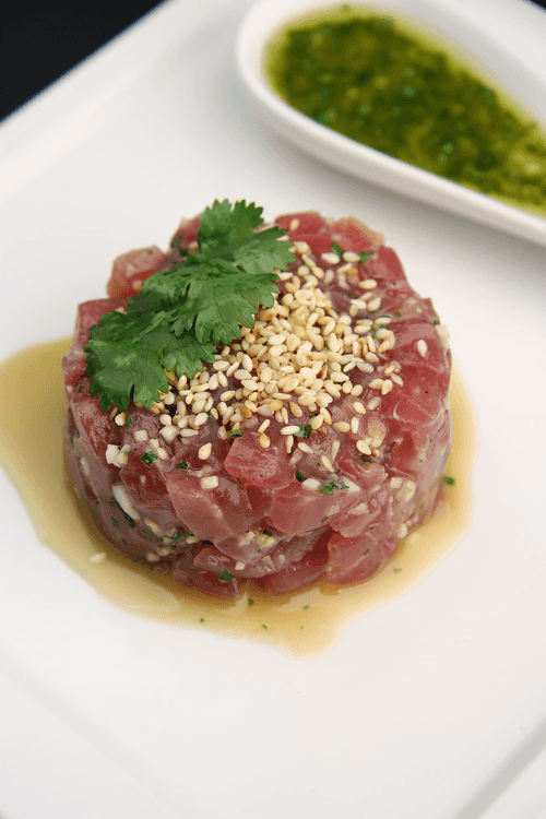 Wild tuna tartare with ginger-honey sauce and sesame seeds