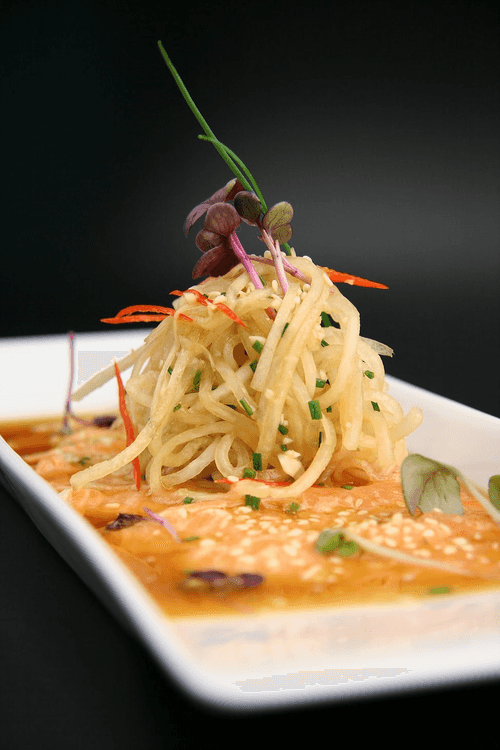 Salmon fillet carpaccio with ginger marinade, accompanied by daikon noodles