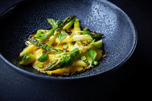 Grilled asparagus with yuzu hollandaise is a gastronomic masterpiece that harmoniously combines tenderness and spiciness. The yuzu hollandaise adds a refined tang and rich creamy flavor that perfectly complements the crispy, slightly charred asparagus. Wasabi adds a subtle heat, while green peas and watercress provide freshness. This dish embodies the balance of Asian and European culinary traditions, with textures and aromas creating true delight for gourmets. The grilled asparagus achieves appetizing caramelization, while the delicacy of rice chips completes the composition, adding a play of textures to the dish. Such a culinary masterpiece is perfect for festive dinners or gourmet tastings.
